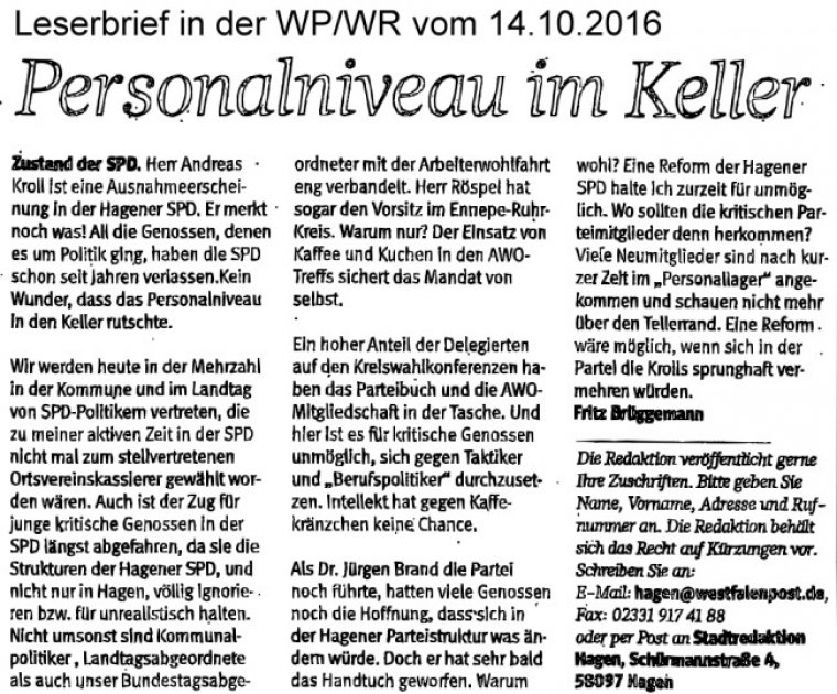 Dass sich Herr Brüggemann aufgrund seines persönlichen Nichtwerdegangs schon immer abfällig zur Hagener SPD oder AWO äußert, ist nichts Neues. Dass er mir persönlich unterstellt, ich sei aus taktischen Gründen oder aus einem Machterhaltungstrieb heraus ehrenamtlich für die AWO engagiert, ist auch bloß die Beleidigung meiner Person. Die Behauptung allerdings, dass sich die Mitglieder der AWO durch den Einsatz von Kaffee und Kuchen kaufen ließen, um mir mein Mandat zu sichern, ist ein Schlag ins Gesicht all der vielen ehrenamtlich engagierten Menschen, die sich regelmäßig für unsere Gesellschaft einsetzen. Welches Bild hat Herr Brüggemann denn von Ehrenamtlichen? Ich erlebe AWO-Mitglieder (und Ehrenamtliche in anderen Organisationen) als selbstständig denkende und selbstbewusste Menschen, die was für andere tun - und nicht als „käuflich". Möglicherweise war Herr Brüggemann seiner Zeit nur Mitglied in der AWO und in der SPD, um einen persönlichen Profit daraus zu schlagen, aber er sollte es doch bitte unterlassen, von sich auf andere zu schließen.