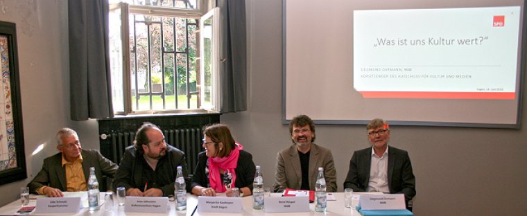 Margarita Kaufmann, Kultur-Beigeordnete der Stadt Hagen, forderte die Bundespolitiker zu mehr „struktureller Förderung“ der Kultur auf, „die Projektitis ist eine Krankheit, an der wir verzweifeln.“ Kulturausschuss-Vorsitzender Sven Söhnchen sah Hagen keineswegs als „kulturpolitischen Einzelfall“, sondern wie fast alle Ruhrgebietskommunen aufgrund ihres Strukturwandels als Städte mit besonderem Förderungsbedarf. Darauf müsse Berlin Antworten geben. Udo Schmalz vom Hasper Hammer ging die ganze Diskussion zu sehr ums Geld: „Der Wert der Kultur ist etwas anderes.“
