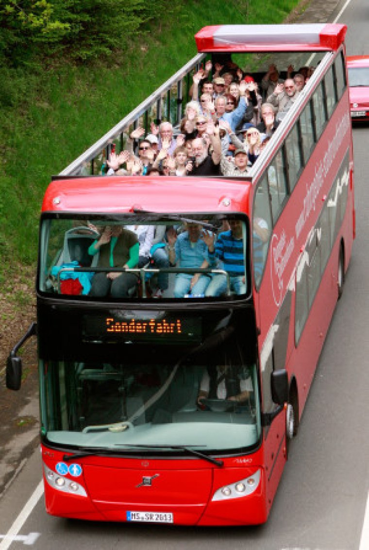 Mit dem Doppeldecker-Cabrio-Bus führt René Röspels Reise durch den "schönsten Wahlkreis der Welt". Foto: Bernd Henkel