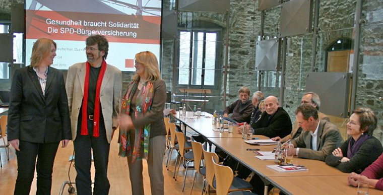 Deutschland ist eines der letzten Länder in Europa, das sich neben einer gesetzlichen auch eine private Krankenversicherung erlaubt, sagte Bärbel Bas, die vor ihrer Zeit als Abgeordnete bei einer Krankenkasse gearbeitet hat. Zehn Prozent der Menschen seien privat versichert. Die Bundesregierung habe die „Kopfpauschale“ – gemeint ist der Zusatzbeitrag – eingeführt und „im Stillen“ die Beitragsbemessungsgrenze abgesenkt und damit noch mehr Menschen die Möglichkeit gegeben, sich der gesetzlichen Versicherung zu entziehen, sagte Christel Humme: „Das höhlt die Solidarität im Gesundheitswesen immer weiter aus.“ Die SPD wolle zurück zu einkommensabhängigen Beiträgen. Berücksichtigt werden müssten aber nicht nur Löhne und Gehälter, sondern auch alle anderen Einkommensarten.