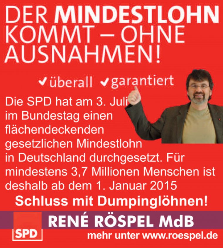 Der Bundestag hat am 4. Juli das Tarifautonomiestärkungsgesetz verabschiedet und damit einen flächendeckenden gesetzlichen Mindestlohn in Deutschland eingeführt, der ab dem 1. Januar 2015 für mindestens 3,7 Millionen Menschen das Ende von Niedriglöhnen bedeutet. Arbeit bekommt damit endlich ihren Wert zurück.