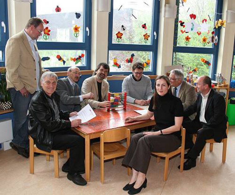 Im Mehrzweckraum des AWO-Familienzentrums Loh rechneten (von links) KiTa-Leiter Dirk Hiby, AWO-Kreisvorsitzender Adi Ostertag, Prof. Rainer Bovermann MdL, René Röspel MdB, Architekt Lars Wehnau, Verena Lange von der Stadt Schwelm, Bürgermeister Jochen Sto